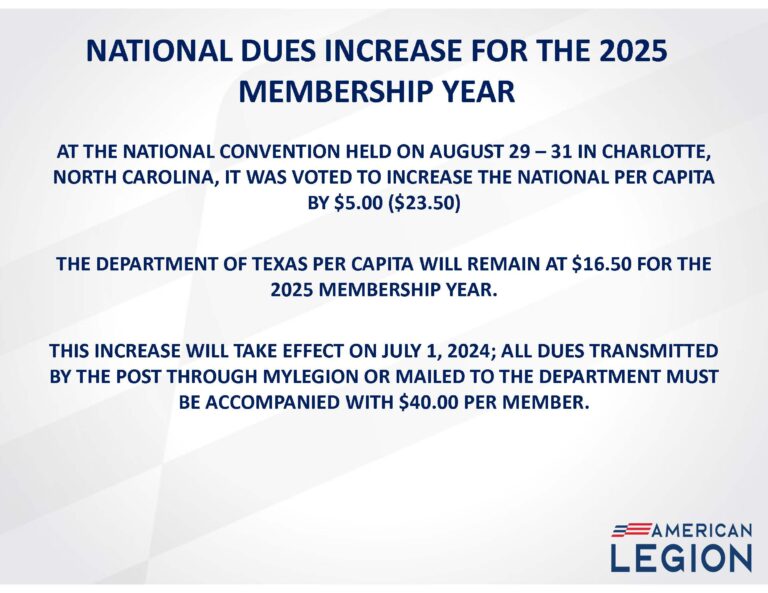 AT THE NATIONAL CONVENTION HELD ON AUGUST 29 – 31 IN CHARLOTTE, NORTH CAROLINA, IT WAS VOTED TO INCREASE THE NATIONAL PER CAPITA BY $5.00 ($23.50) THE DEPARTMENT OF TEXAS PER CAPITA WILL REMAIN AT $16.50 FOR THE 2025 MEMBERSHIP…